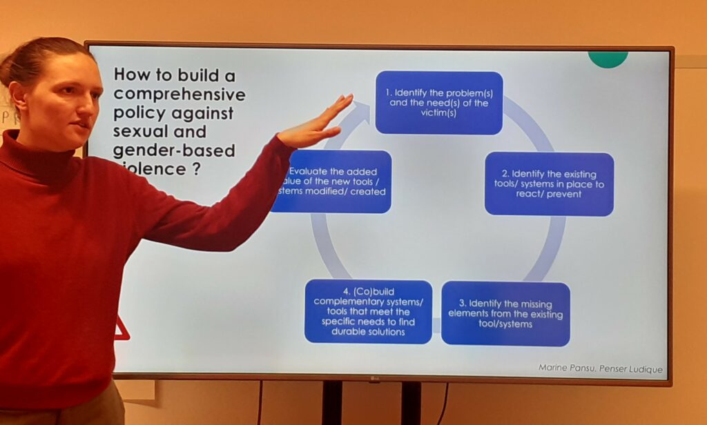 Elle intervient à ce moment-là sur une conférence interactive sur les VSS dans l’Union Européenne et un atelier participatif sur la façon de créer une politique interne globale pour agir contre les VSS.