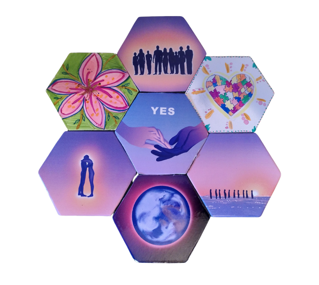 Et chaque partie se termine par la complétion du plateau de jeu de visions de potentielles sociétés inclusives. Plus on joue, plus les visions proposées par l’équipe de création et/ou dessinés par les joueurs se superposent. La société discriminante et violente disparait progressivement au profit d’une société où la communication constructive, inclusive et interculturelle prévaut.
